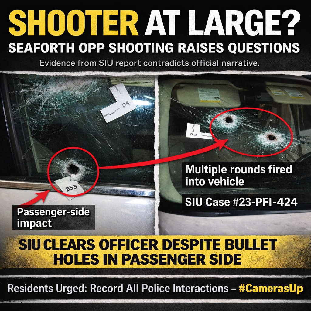 (Seaforth, Ontario) Huron OPP are now facing attempted murder allegations after an apparent botched execution attempt in Seaforth. NOTE: Traditional media have used a cropped photo to help cover-up the unjustified shooting. The image below is from the SIU report, and contains one of the bullet holes proving it was an unjustified shooting. All other […]
