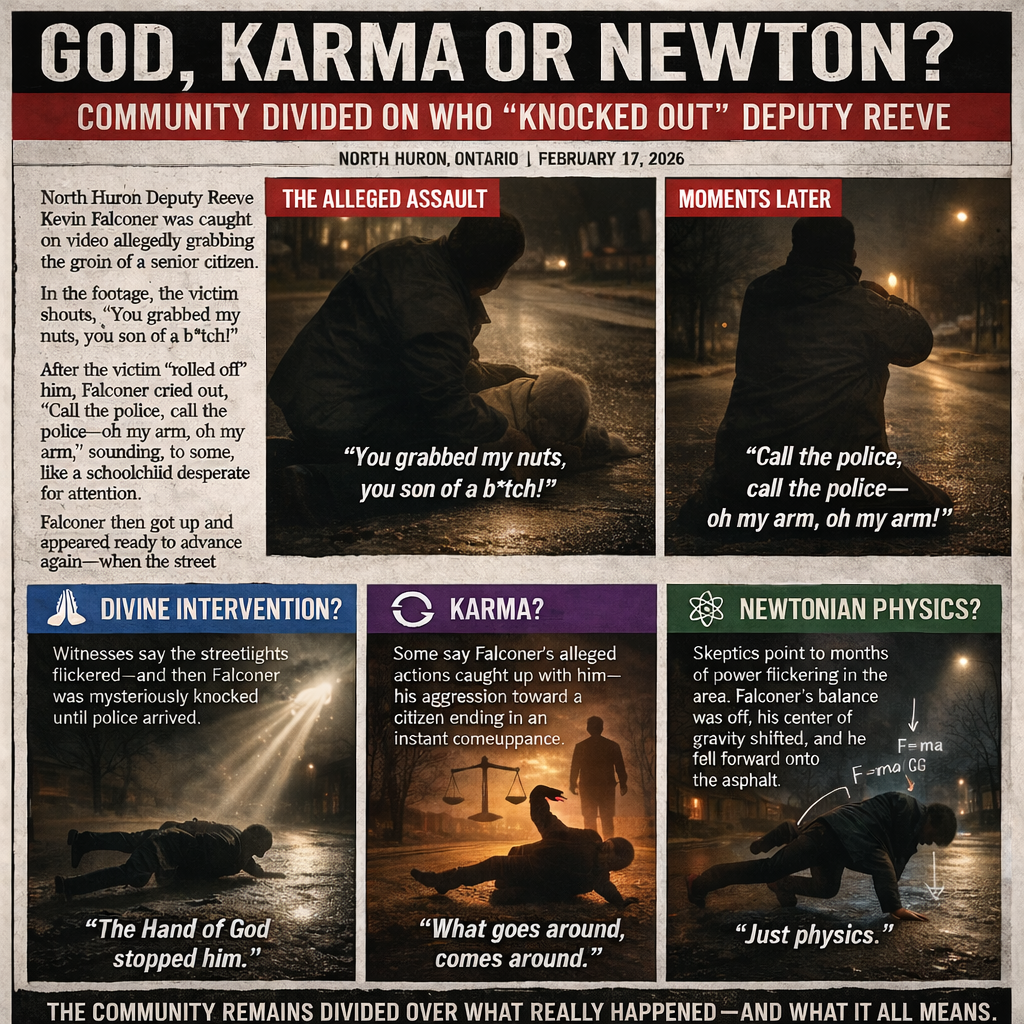 (Wingham, North Huron, ON) On February 17, 2026, North Huron Deputy Reeve Kevin Falconer was caught on video allegedly grabbing the groin of a senior citizen. In the footage, the victim can be heard shouting, “You grabbed my nuts, you son of a b*tch!” After the victim reportedly rolled off his alleged attacker, Falconer cried […]