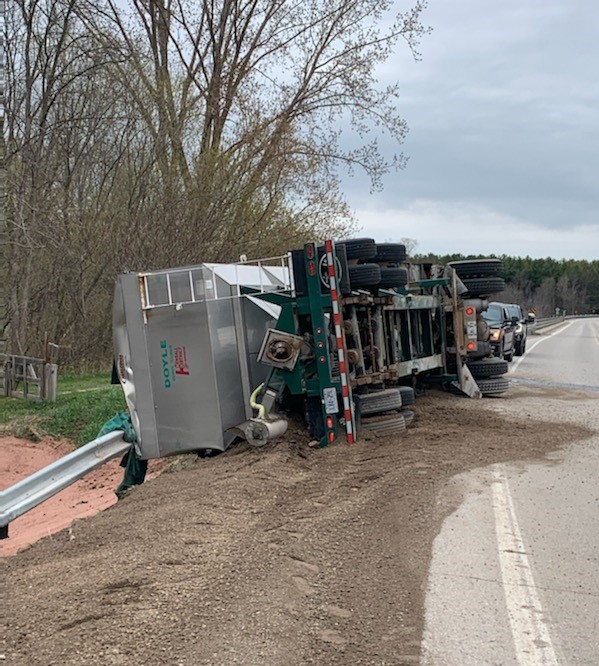 This afternoon at approximately 4:30 p.m. Huron OPP officers, Goderich Fire Department and Huron County Paramedic Services responded to the crash scene located on Sharpes Creek Line near Forresters Line. Upon arrival officers located a tractor trailer overturned on the west shoulder of the roadway with a load of granular fertilizer spilled into the ditch.