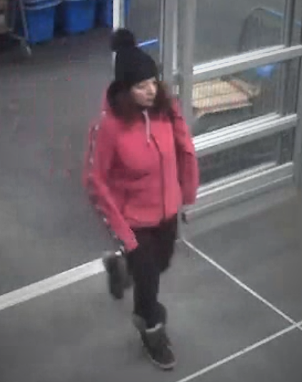 Female suspect: Approximately 30 years of age, Caucasian, 5’5″ tall, red died hair. Wearing a pink jacket, black toque, black tights, and black boots with fur tops.