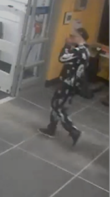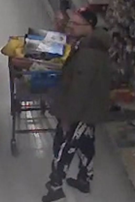 Male suspect: Approximately 30 years of age, Caucasian, 6′ tall, short hair, brown beard, eyeglasses. Wearing a black and white “NIKE’ track suit, a black baseball hat with a green brim, and black running shoes. (Note – 2nd photo shows suspect wearing a brown jacket that was stolen from store).