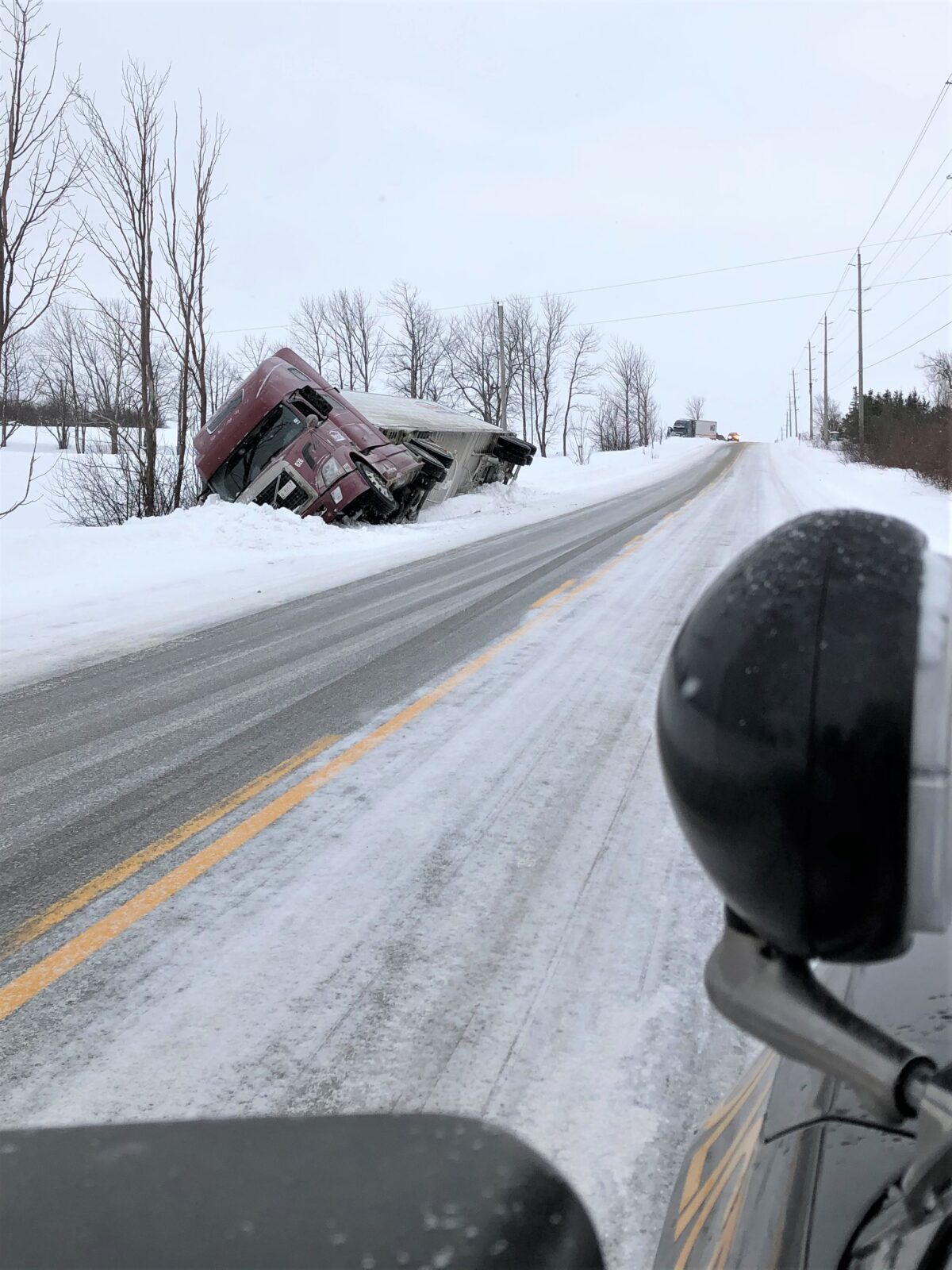 A tractor trailer had lost control and slid into the ditch and then a short time later, another tractor trailer slid off the roadway, trying to avoid colliding the other transport in the ditch.