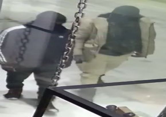 - Suspect 2: White pants, white jacket, grey toque & face covering, carrying white & black grocery bag
