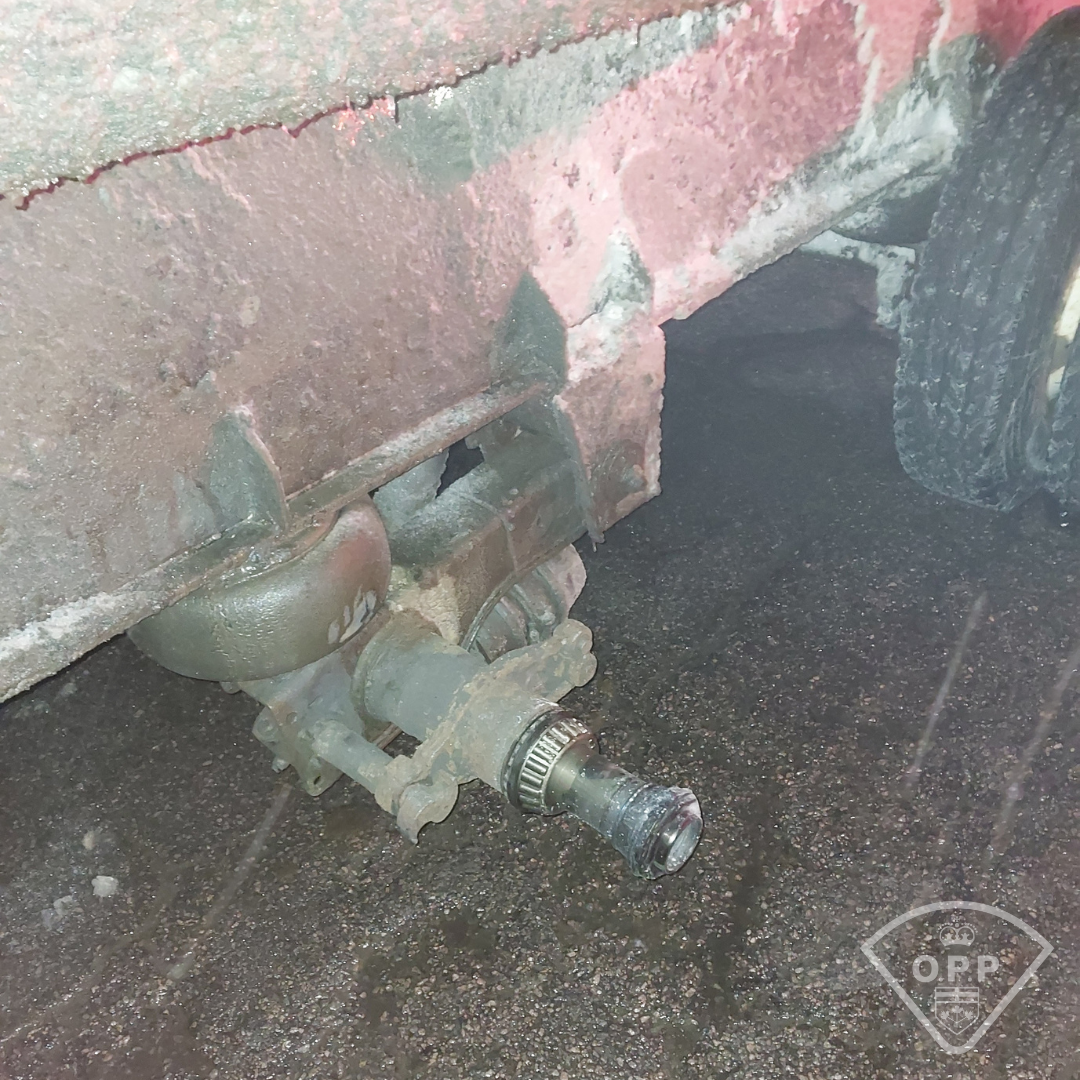 On Thursday February 26, 2026, at approximately 9:45 p.m., the OPP received several reports from motorists about a southbound tractor‑trailer emitting smoke and an electrical burning smell. One caller also reported seeing sparks. While patrolling the area, officers located a detached trailer wheel on the shoulder of Highway 11 near Highway 654. The wheel was extremely hot to the touch, and sheared lug bolts and metal fragments were observed inside.
