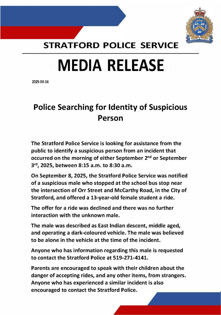 On September 8, 2025, the Stratford Police Service was notified of a suspicious male who stopped at the school bus stop near the intersection of Orr Street and McCarthy Road, in the City of Stratford, and offered a 13-year-old female student a ride.