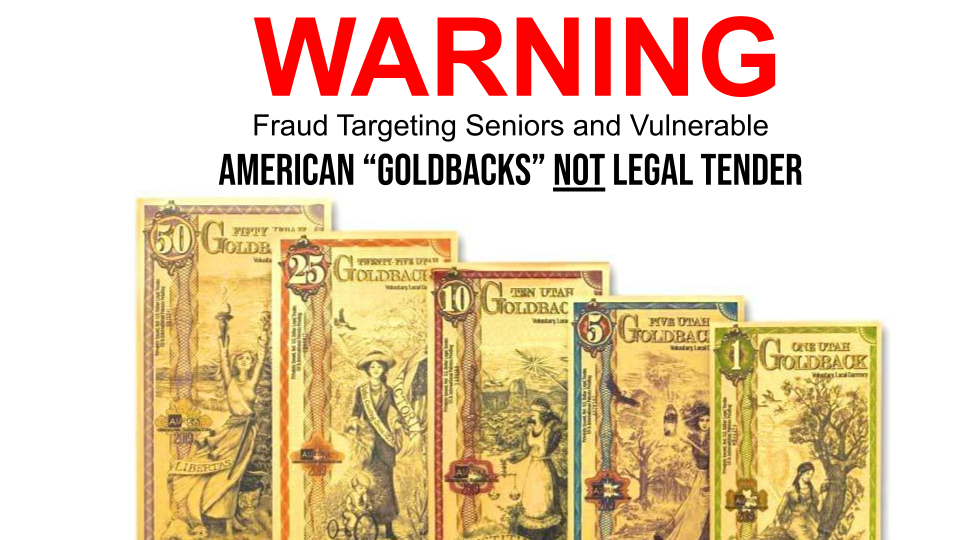 A fraudulent scheme is targeting seniors and Freedom Fighter groups in our area. A cash-only seller is going door to door and appearing at community meetings, falsely claiming that GoldBacks—a privately-issued, gold-foil currency—are legal tender in the United States.