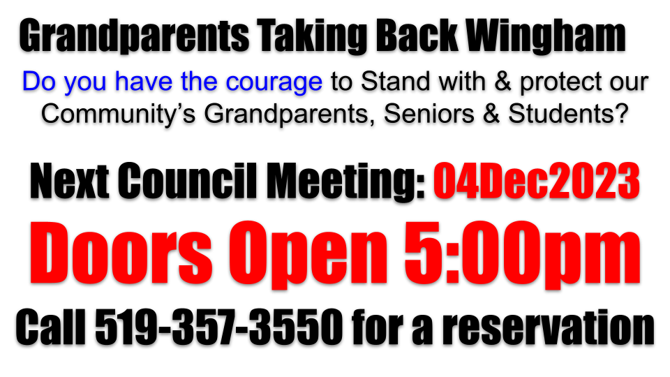 The next council meeting is 04Dec2023 at Wingham Town Hall Heritage Theatre. Arrive early, or call Town Hall at 519-357-3550 to reserve a seat, ask for sunshine list member CAO Dwayne Evans.