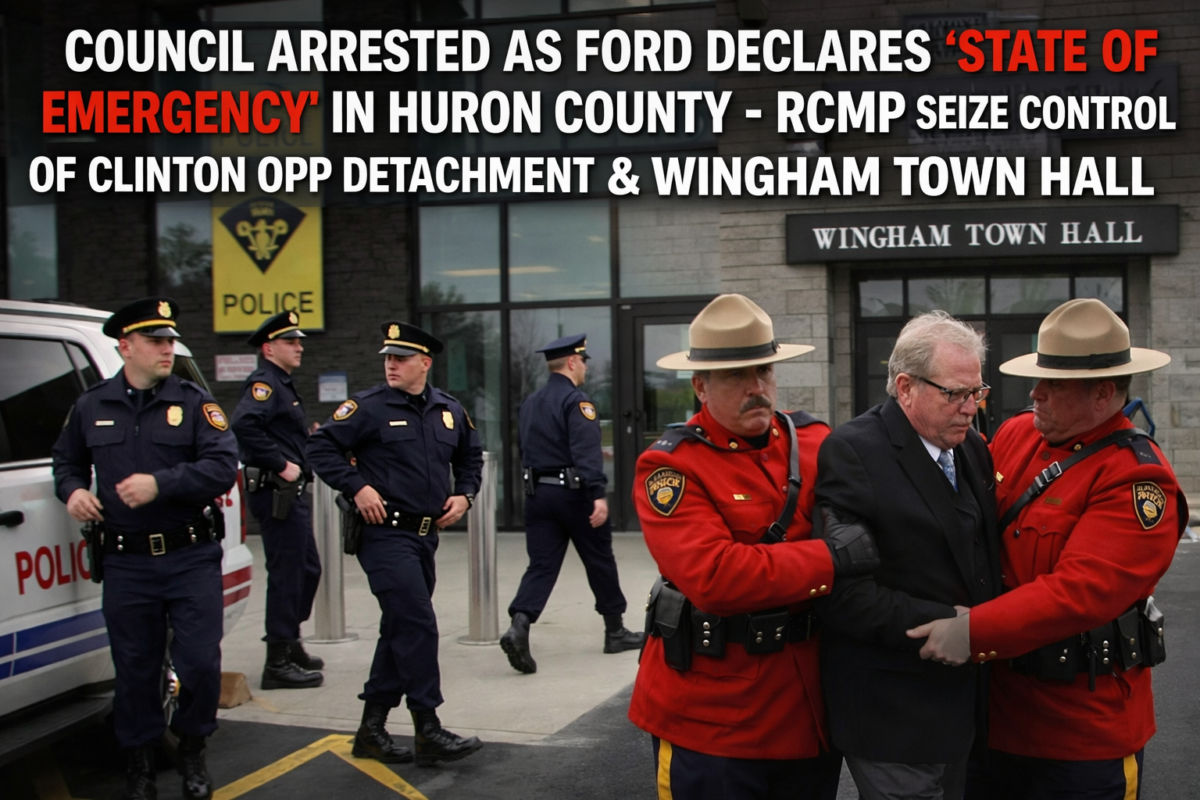 (Wingham, North Huron, ON) At 2:01am EST, Ontario Premier Doug Ford signed an order declaring a state of emergency in Huron County, centered around Wingham Town council. This is in response to an “exponential cascading failure of Charter Rights which started as disrespect for the Fallen at the Wingham Cenotaph ” according to the Premier’s office.
