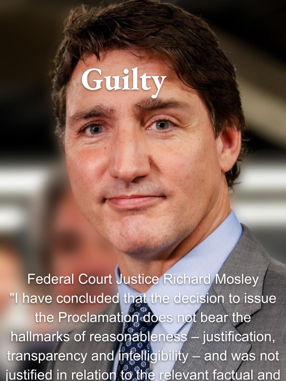 Federal Court Justice Richard Mosley has ruled that current Prime Minister Justin Trudeau is guilty of unconstitutionally using the War Measures Act. This involved threatening tow truck operators, threatening to take truckers children, seizing millions of dollars, freezing bank accounts, releasing names of contributors to the Freedom Convoy, threatening to seize truckers pets and put them down if they weren’t claimed in a few days, and making Canadians live in terror of their “government”. The list of crimes and number of victims is nearly endless due to Justin Trudeau’s illegal use of the War Measures Act.